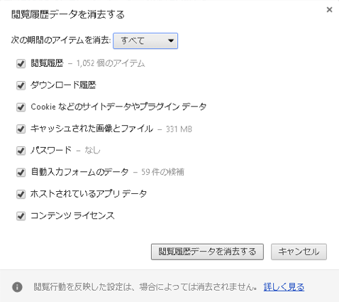 「次の期間のアイテムを消去」の項目を必要に応じて選択、その他必要な項目にチェックを入れて「閲覧履歴データを消去する」をクリックします。
