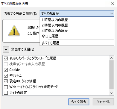 「消去する履歴の期間」の項目を必要に応じて選択、その他必要な項目にチェックを入れて「今すぐ消去」をクリックします。