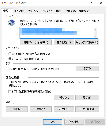 「全般」タブの「閲覧の履歴」の「削除」をクリックします。