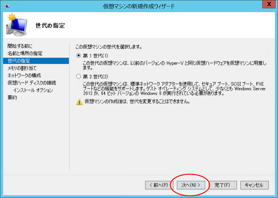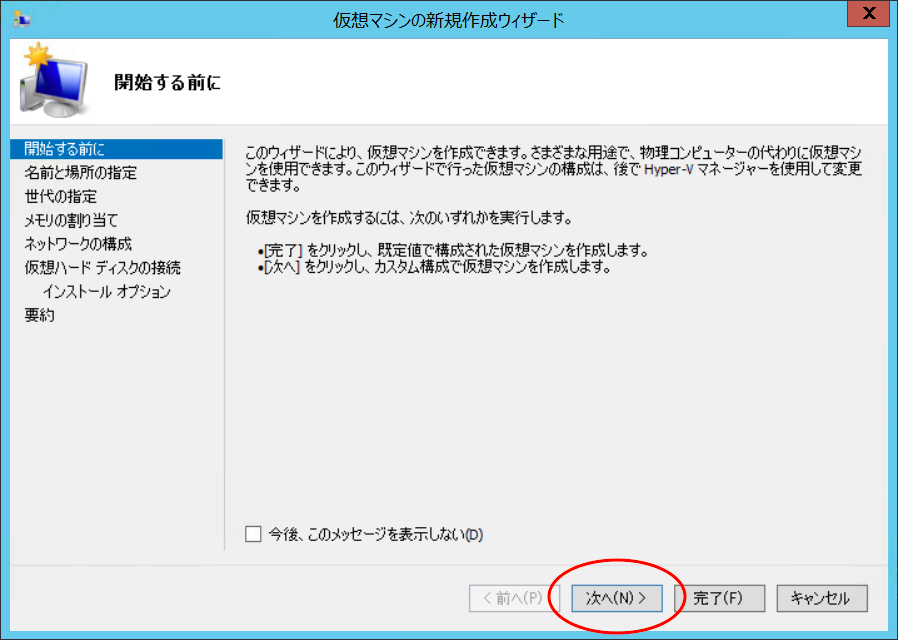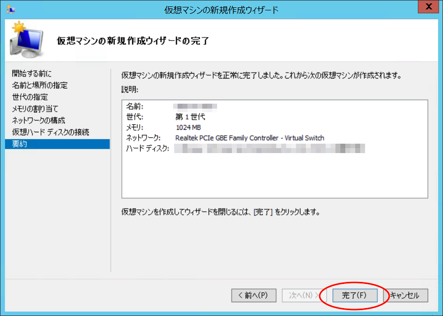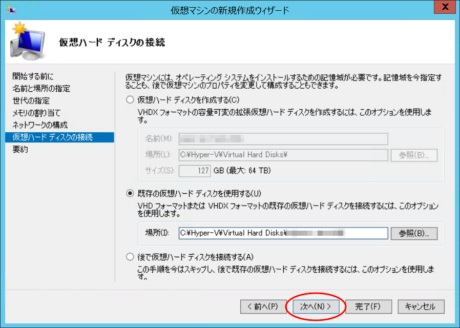 「既存の仮想ハードディスクを使用する」をチェックし、パート1・パート3で変換したVHDファイルを選択して、「次へ」をクリックします。