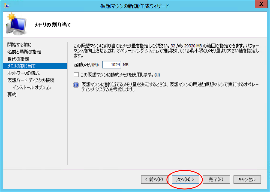 メモリの割り当ては環境に応じて変更してください。入力後、「次へ」をクリックします。