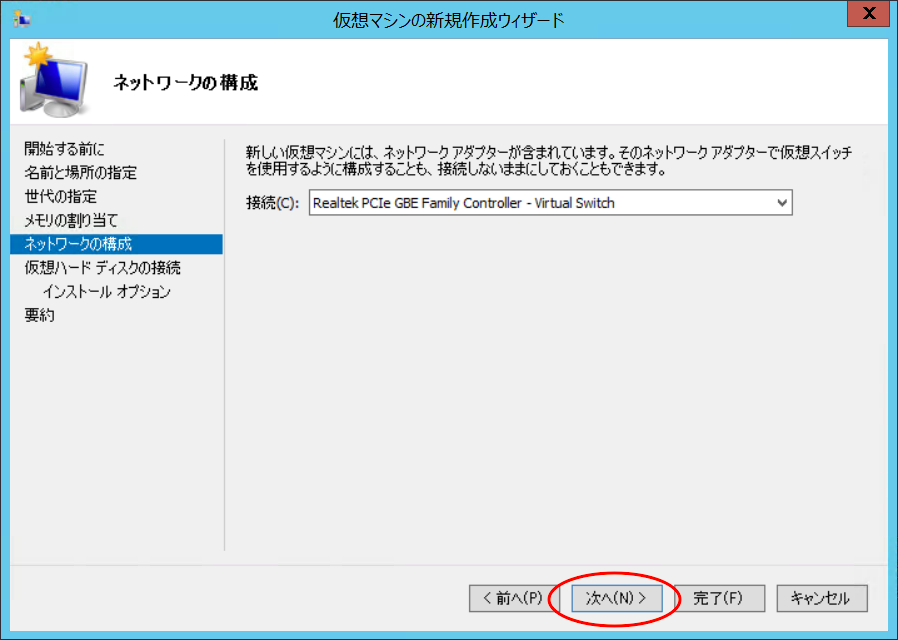 先ほど追加した仮想スイッチを選択して、「次へ」をクリックします。