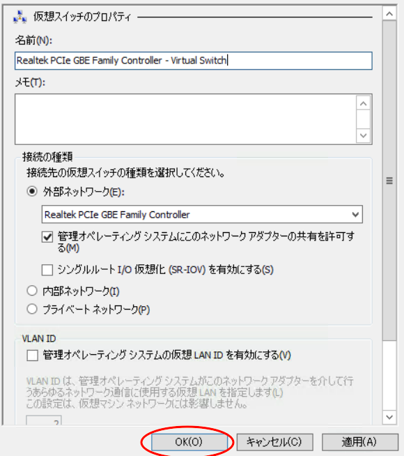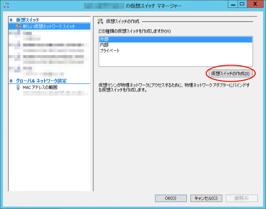 今回は単純にレガシーサーバーの移行なので「外部」を選択し、「仮想スイッチの作成」をクリックします。