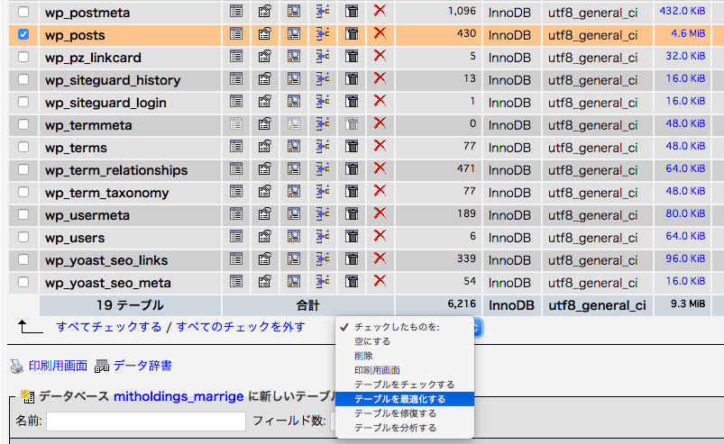 データベースの最適化はphpMyAdminから可能です。対象のテーブルにチェックを入れて「テーブルを最適化する」を選択すると、すぐに実行されます。